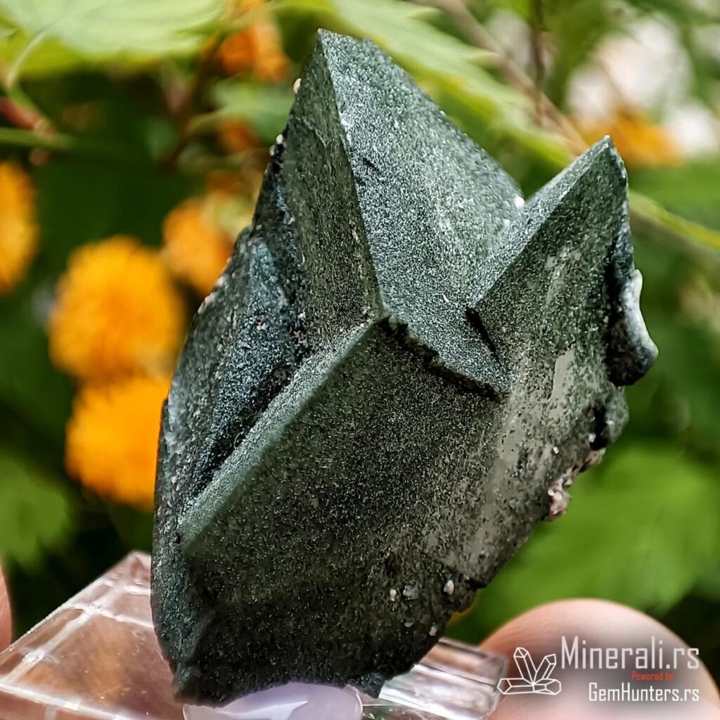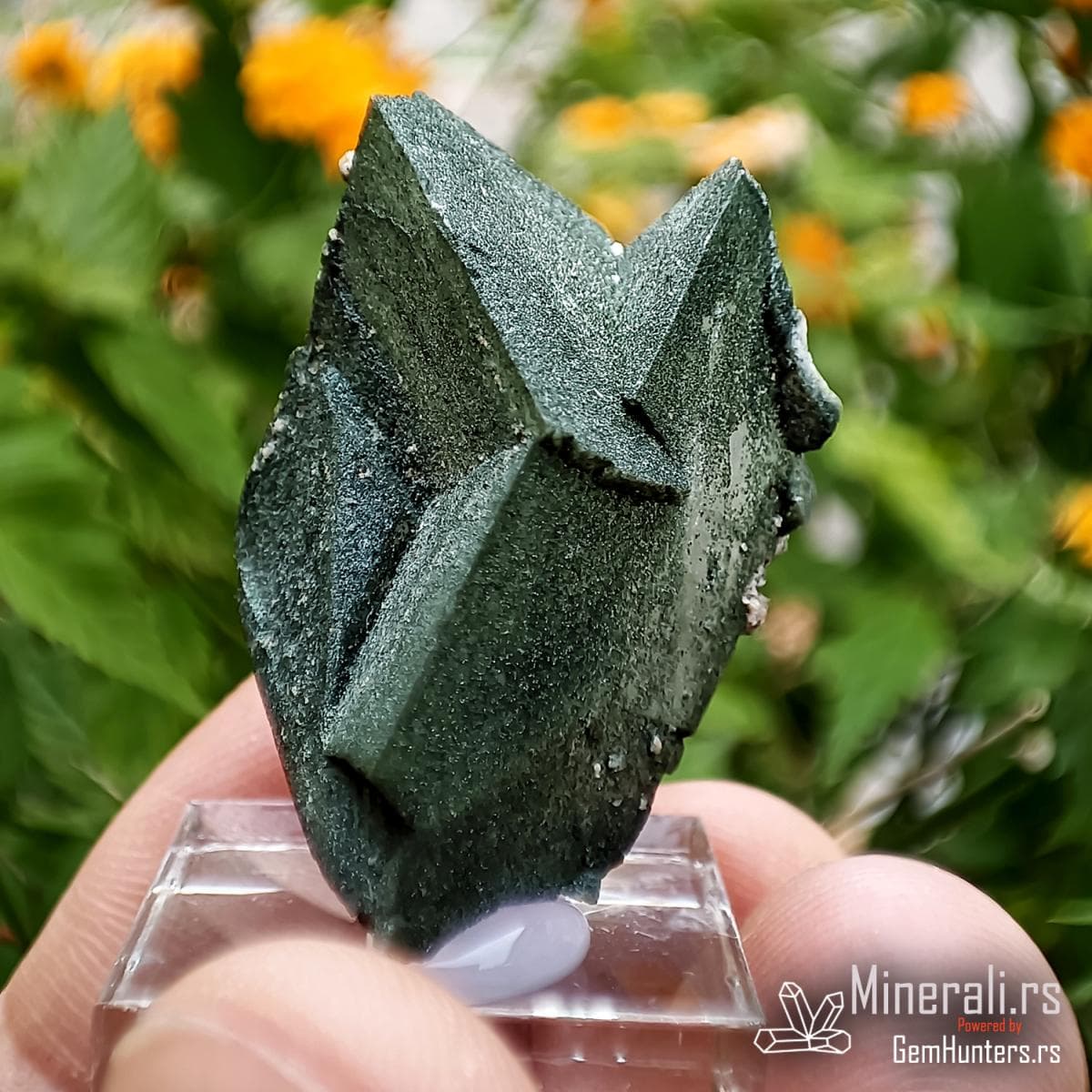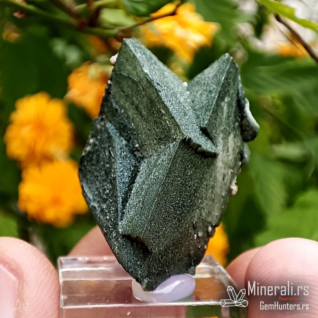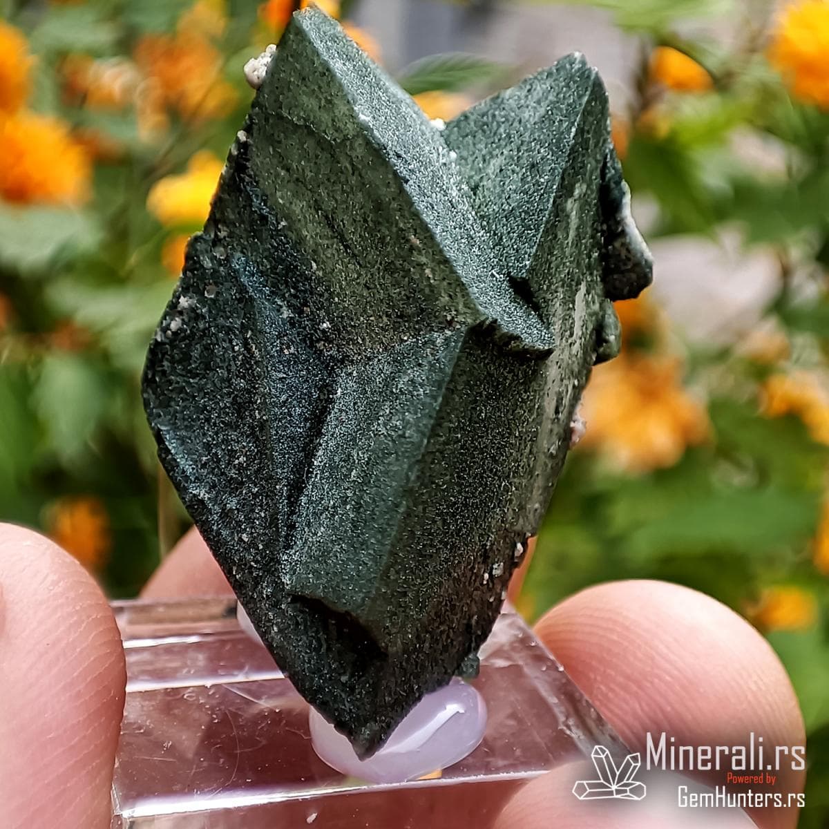 Adular iz Švajcarske, iz doline Etzli u regionu Maderanertal, kanton Uri, jedan je od najpoznatijih alpskih primeraka ortoklasa. Ovaj kristalni uzorak prepoznatljiv je po oštroj romboidnoj formi i zelenkastoj nijansi koja ga čini vizuelno izuzetnim. Površina je prekrivena sitnim zrnima, što ukazuje na sekundarnu mineralizaciju ili postvulkansku alteraciju.