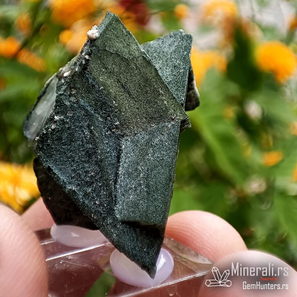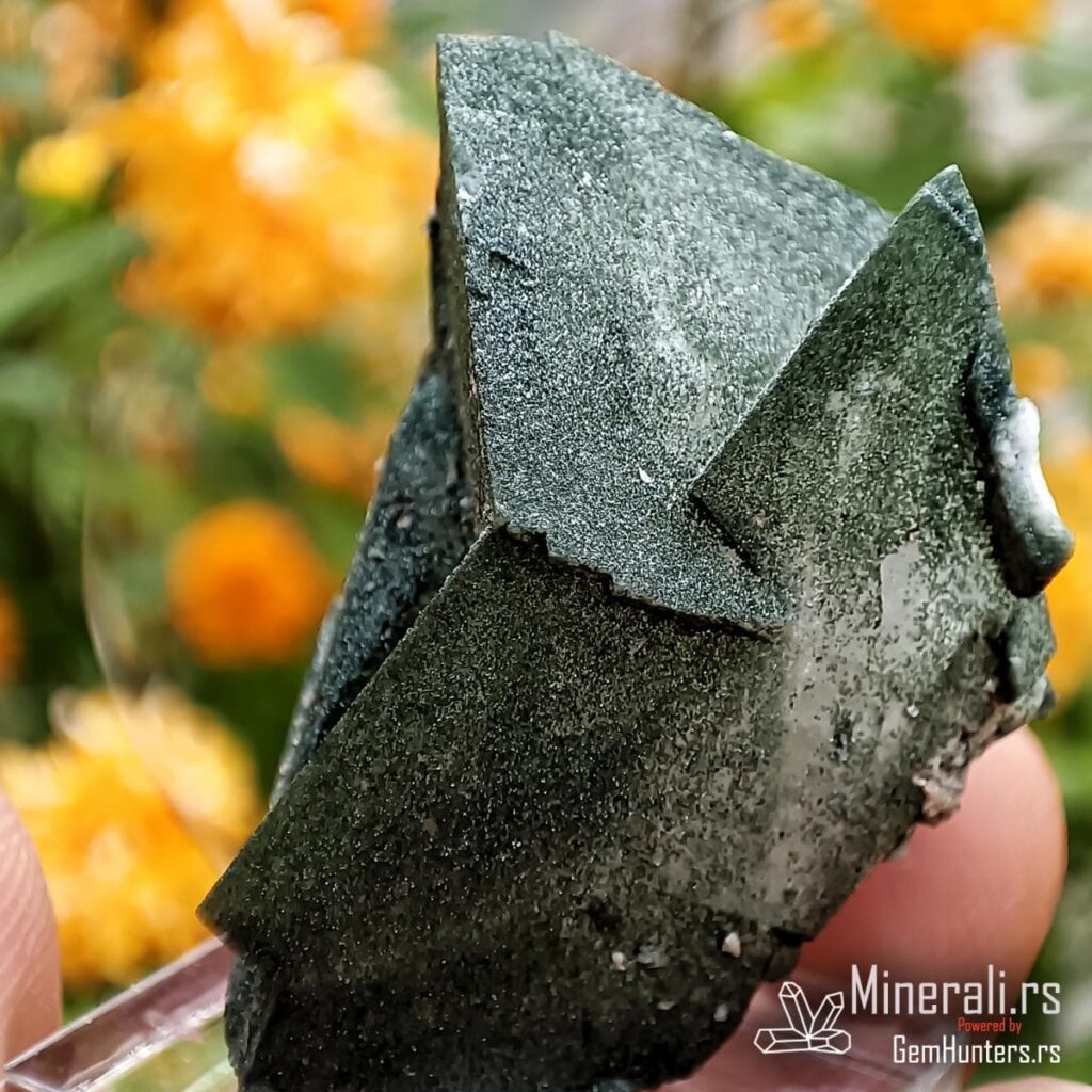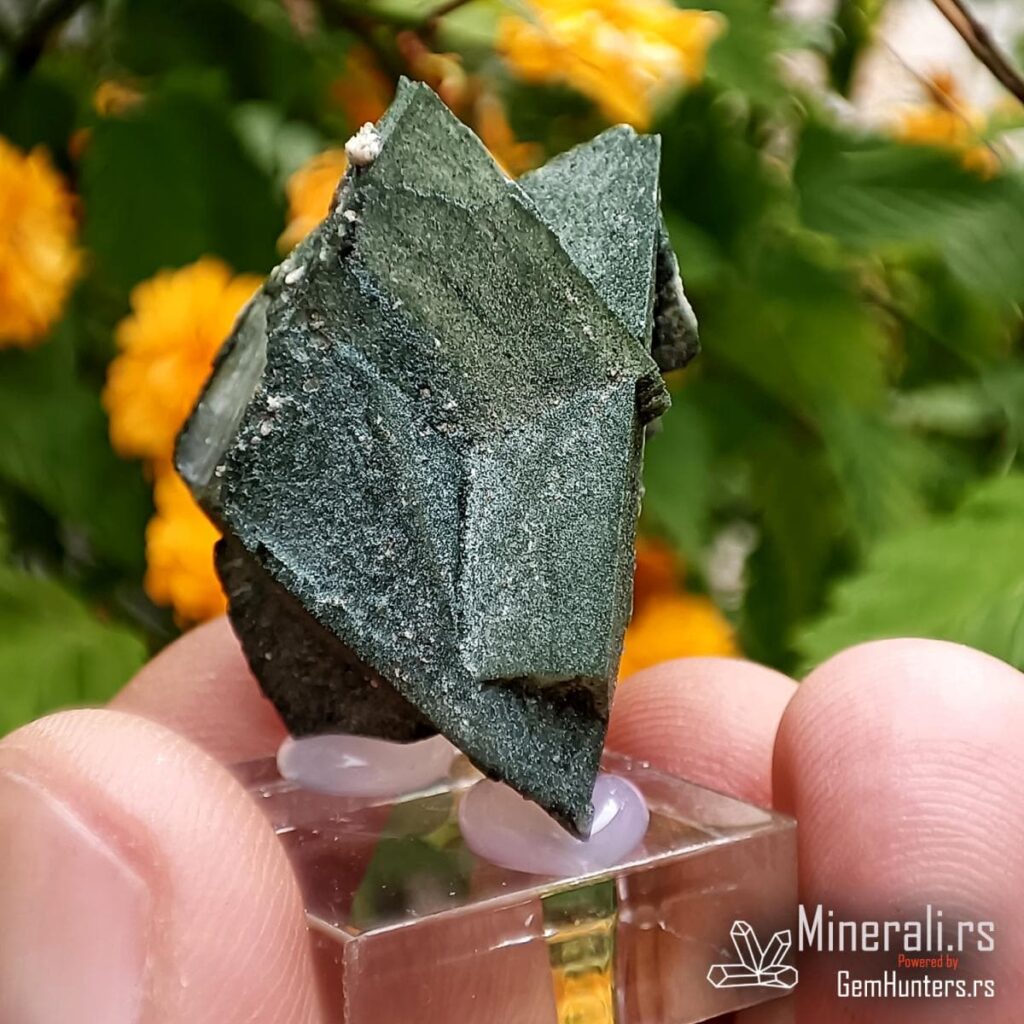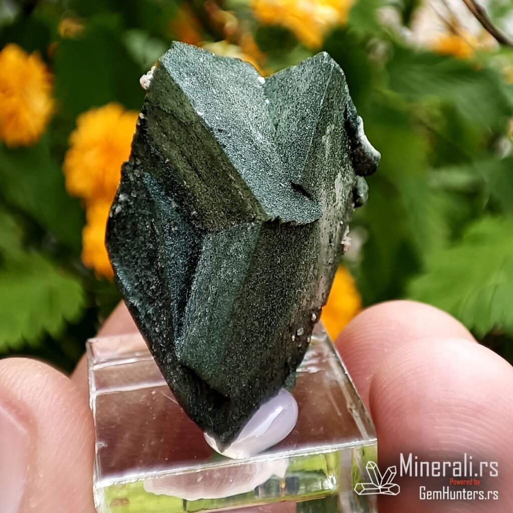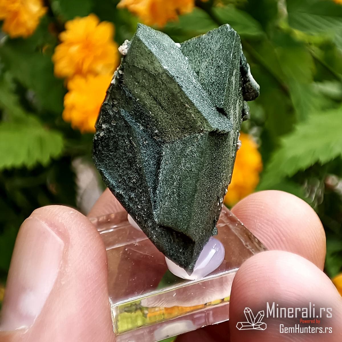 Adular iz Švajcarske, iz doline Etzli u regionu Maderanertal, kanton Uri, jedan je od najpoznatijih alpskih primeraka ortoklasa. Ovaj kristalni uzorak prepoznatljiv je po oštroj romboidnoj formi i zelenkastoj nijansi koja ga čini vizuelno izuzetnim. Površina je prekrivena sitnim zrnima, što ukazuje na sekundarnu mineralizaciju ili postvulkansku alteraciju.