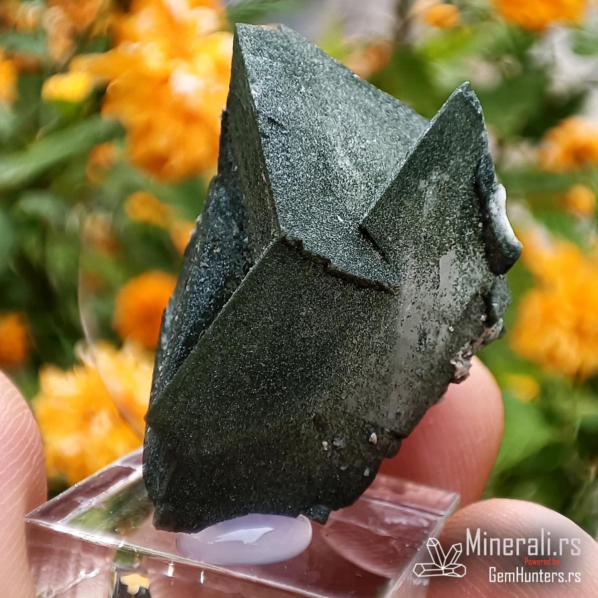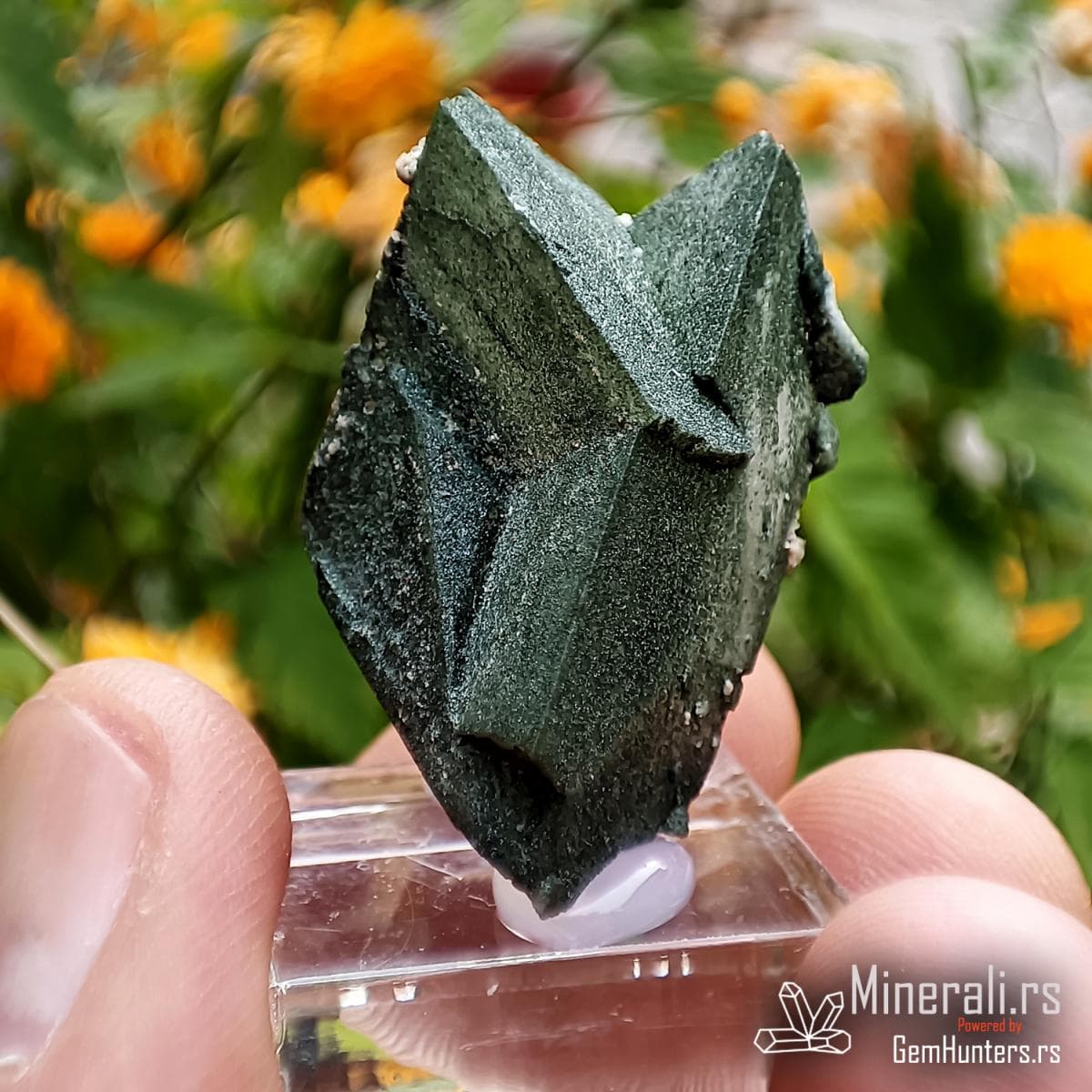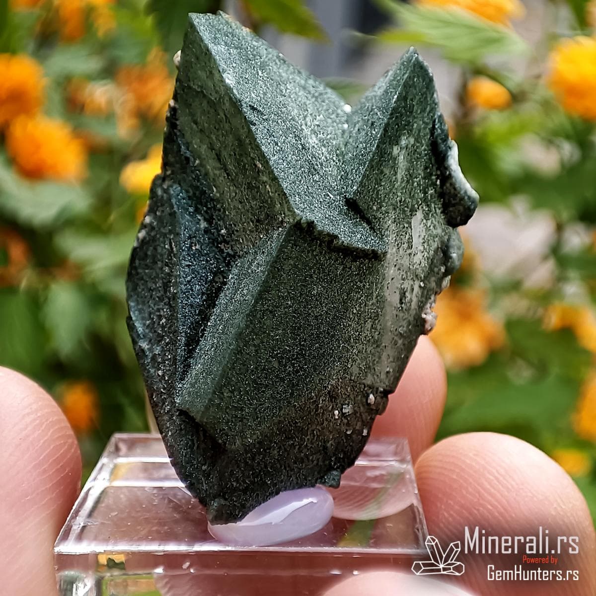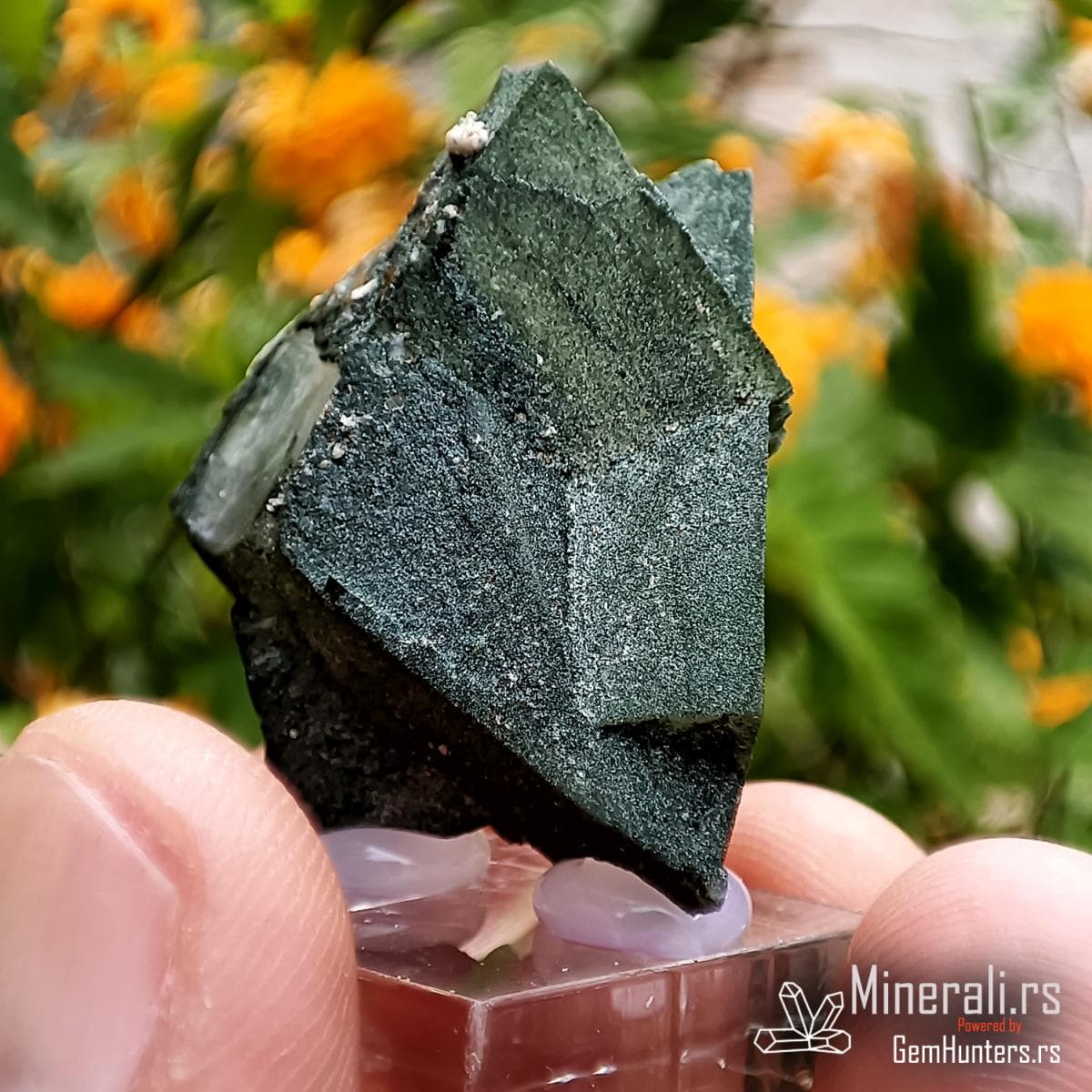 Adular iz Švajcarske, iz doline Etzli u regionu Maderanertal, kanton Uri, jedan je od najpoznatijih alpskih primeraka ortoklasa. Ovaj kristalni uzorak prepoznatljiv je po oštroj romboidnoj formi i zelenkastoj nijansi koja ga čini vizuelno izuzetnim. Površina je prekrivena sitnim zrnima, što ukazuje na sekundarnu mineralizaciju ili postvulkansku alteraciju.