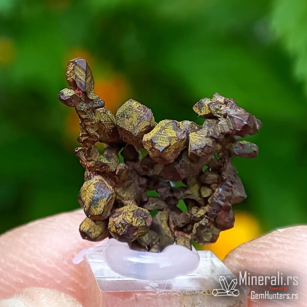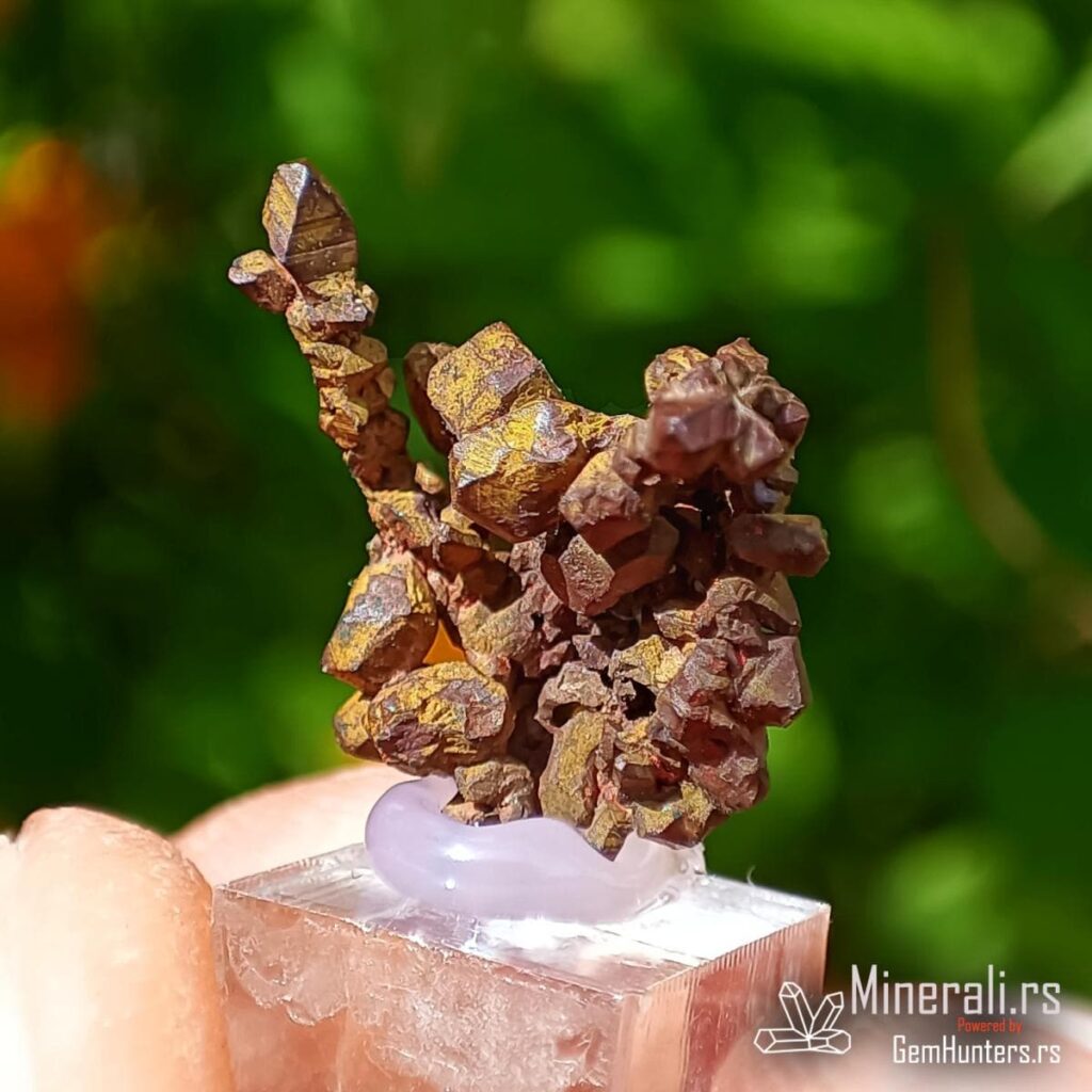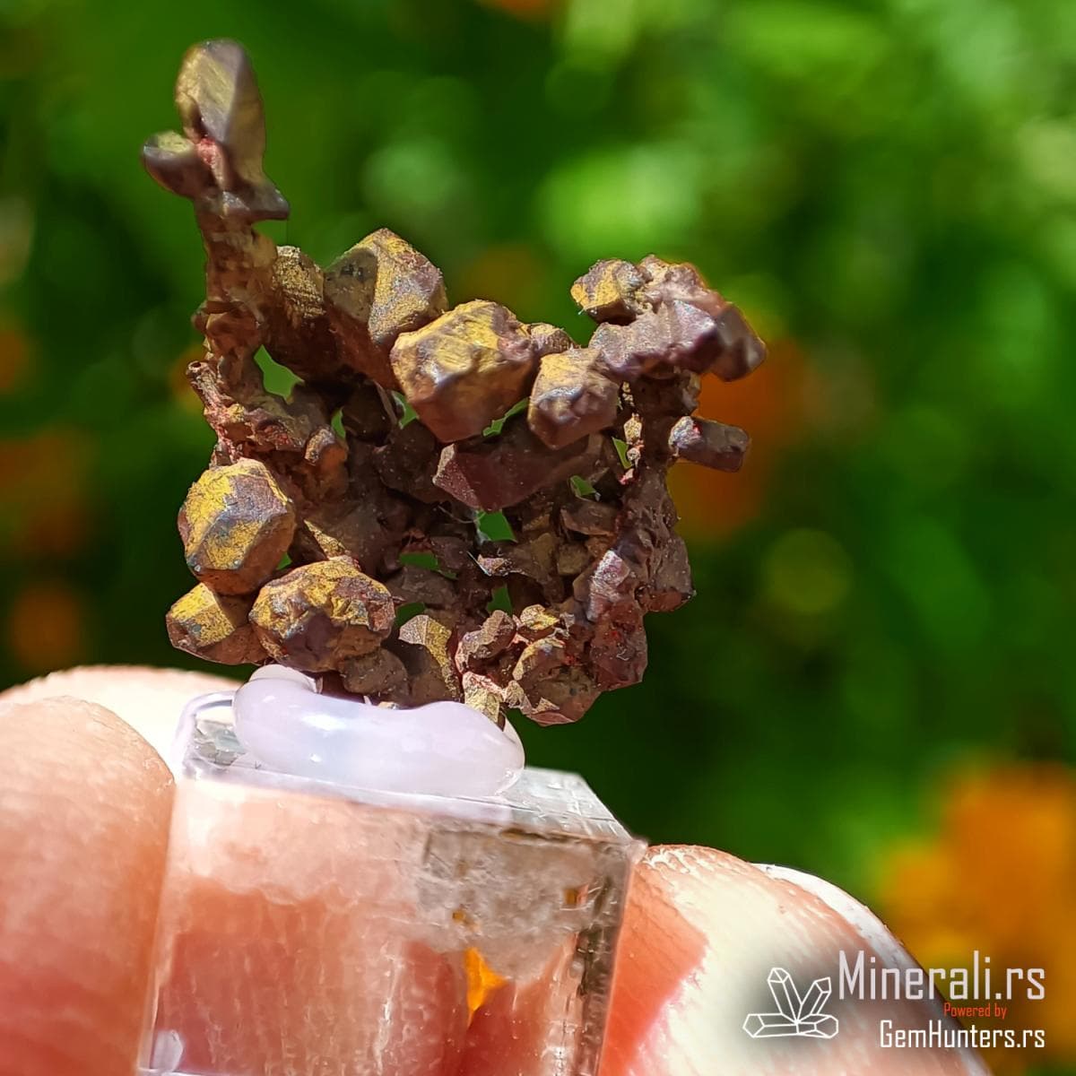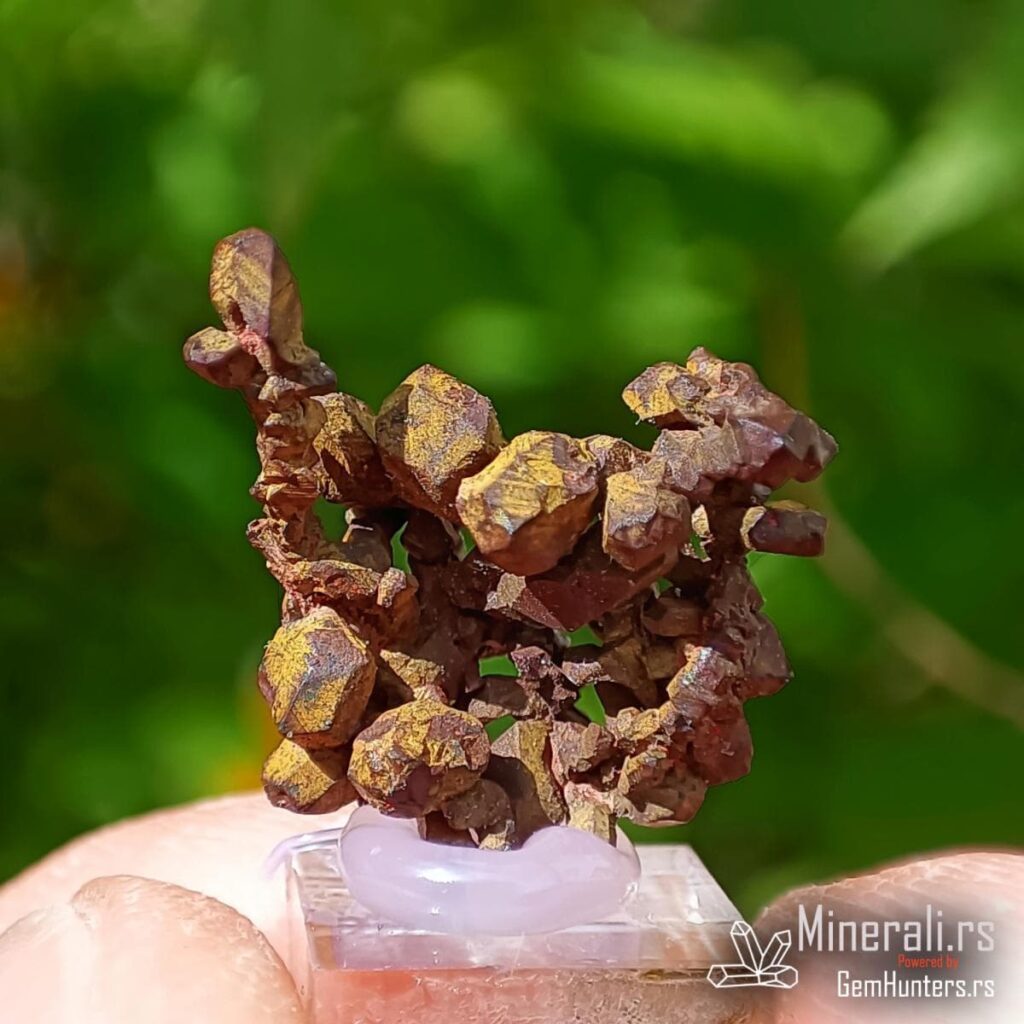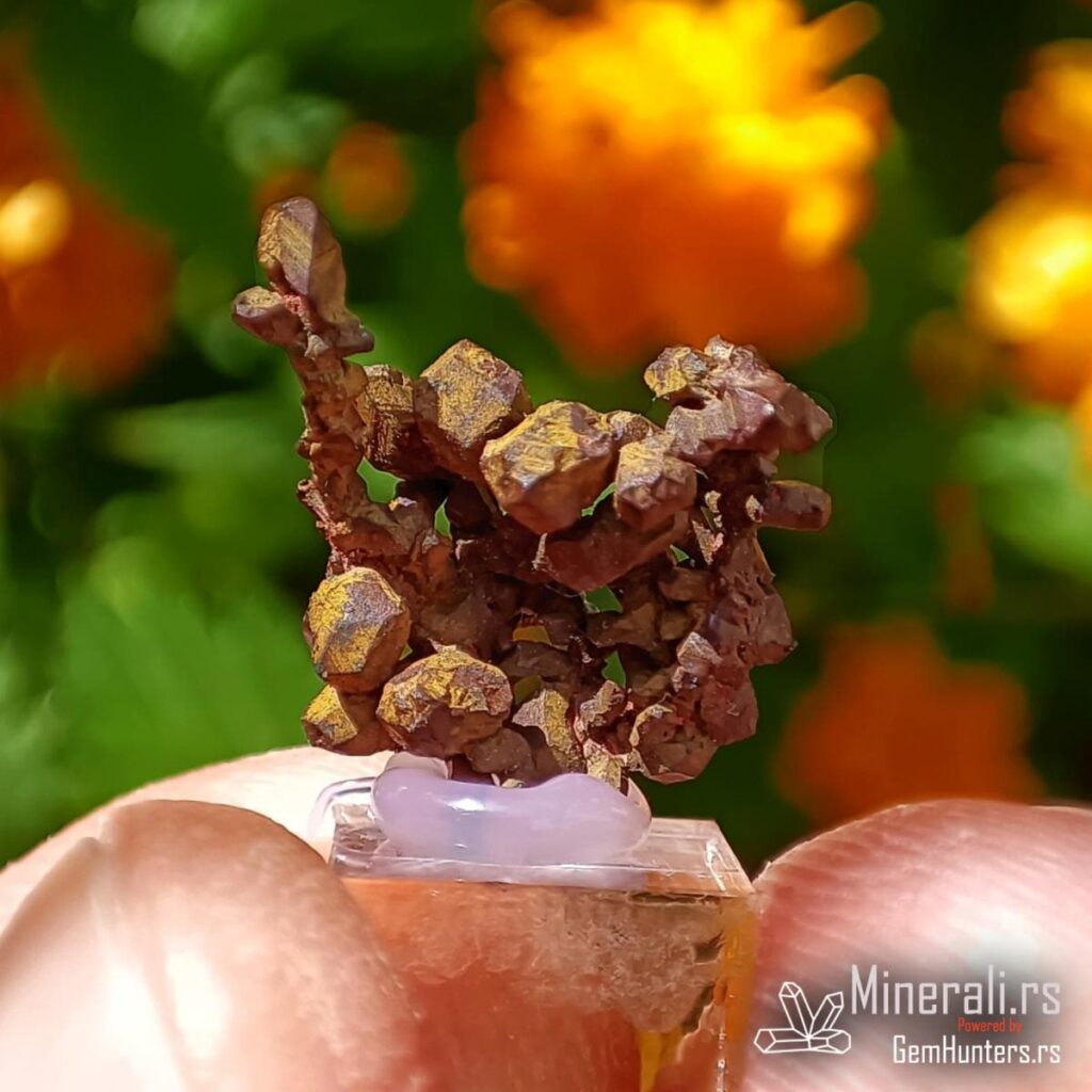 Samorodni bakar (Cu) je prirodni, elementarni oblik bakra koji se javlja u metalnom stanju, bez potrebe za rudarskom obradom radi izdvajanja. U kristalnoj formi, poput ovog uzorka, može formirati granaste, dendritične, zrnaste, ali i jasno definisane kubne i oktaedarske kristale. Ovaj uzorak pokazuje bogatu smeđe-crvenkastu patinu, koja nastaje oksidacijom, i izražene rubove karakteristične za sporo hlađenje u hidrotermalnim šupljinama.