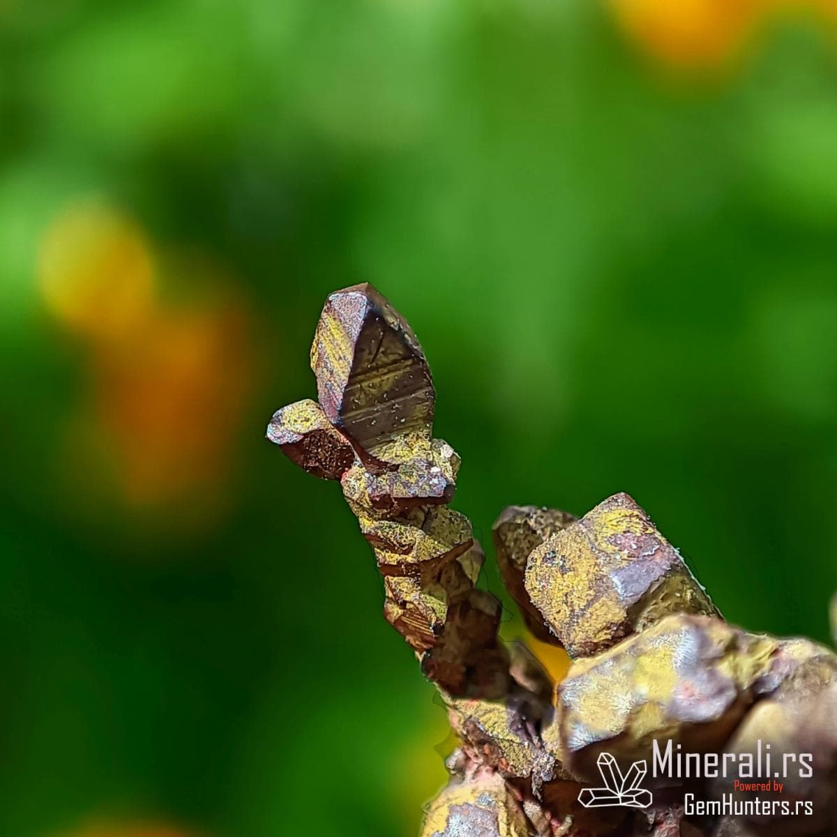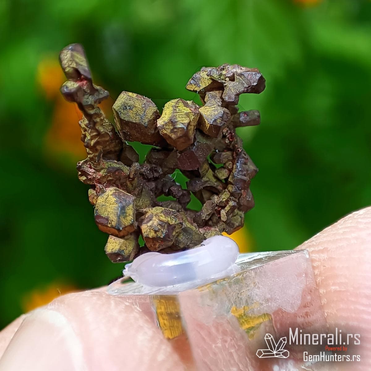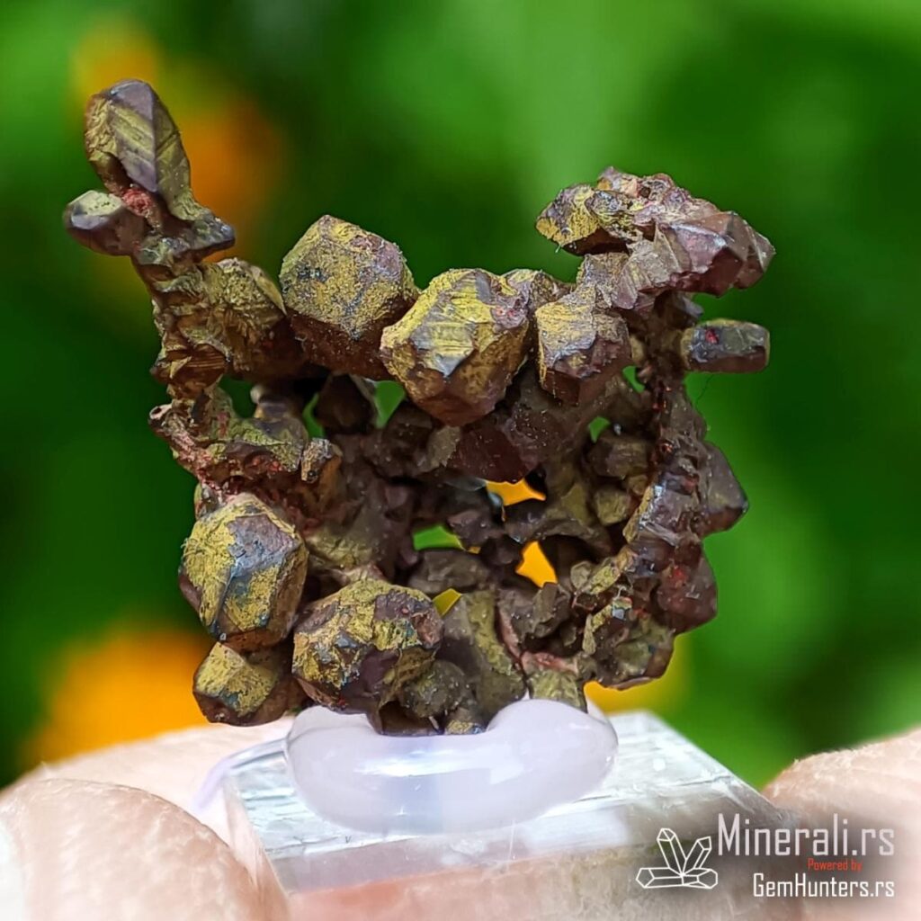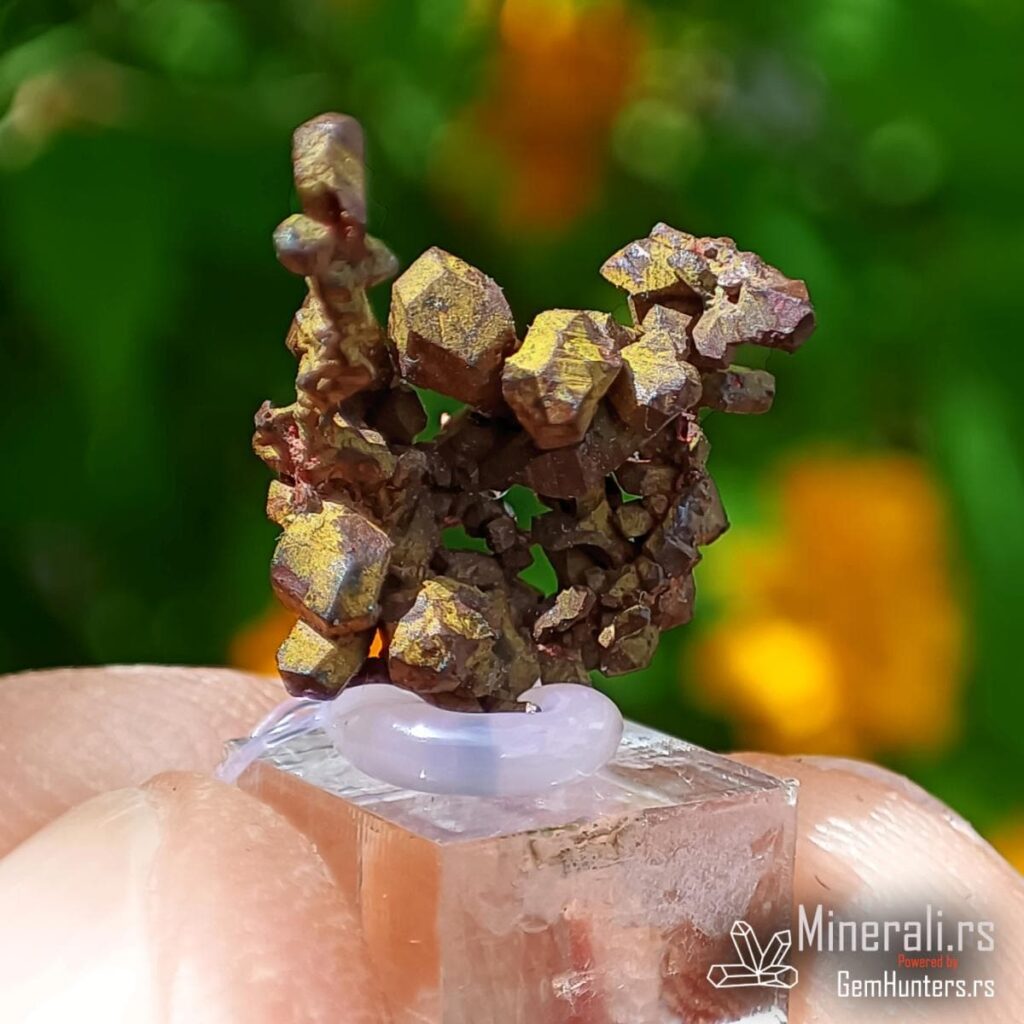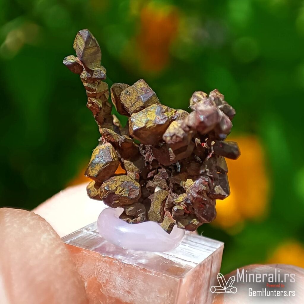Samorodni bakar (Cu) je prirodni, elementarni oblik bakra koji se javlja u metalnom stanju, bez potrebe za rudarskom obradom radi izdvajanja. U kristalnoj formi, poput ovog uzorka, može formirati granaste, dendritične, zrnaste, ali i jasno definisane kubne i oktaedarske kristale. Ovaj uzorak pokazuje bogatu smeđe-crvenkastu patinu, koja nastaje oksidacijom, i izražene rubove karakteristične za sporo hlađenje u hidrotermalnim šupljinama.